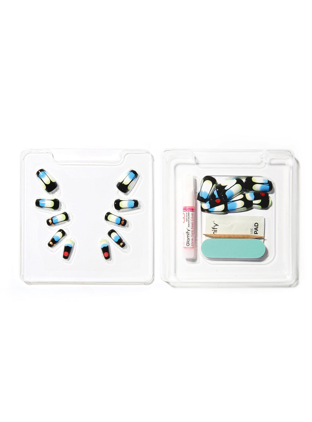 24 Nails (various sizes), 1 Pink Tint Nail Glue, 2 Single-Use Prep Pads, 1 Mini Nail File, 1 Manicure Stick