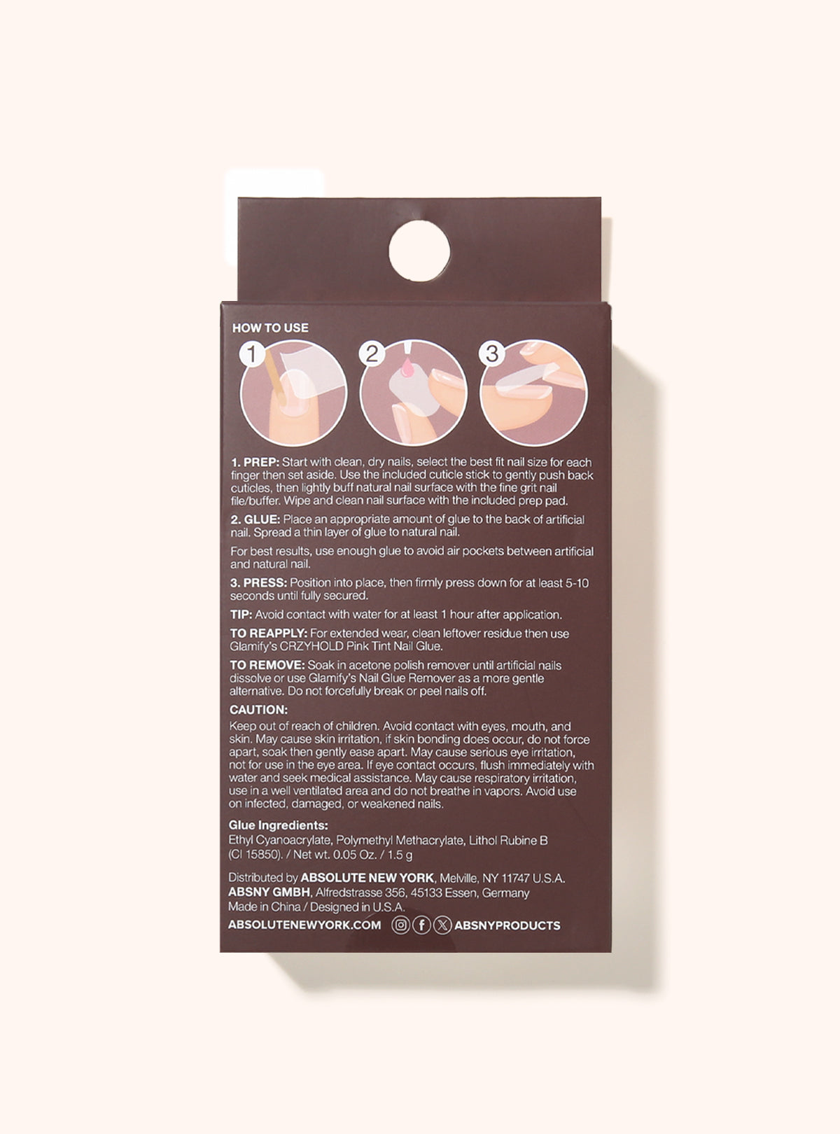 - GLUE: Place an appropriate amount of glue to the back of artificial nail. Spread a thin layer of glue to the natural nail. For best results, use enough glue to avoid air pockets between artificial and natural nail.
